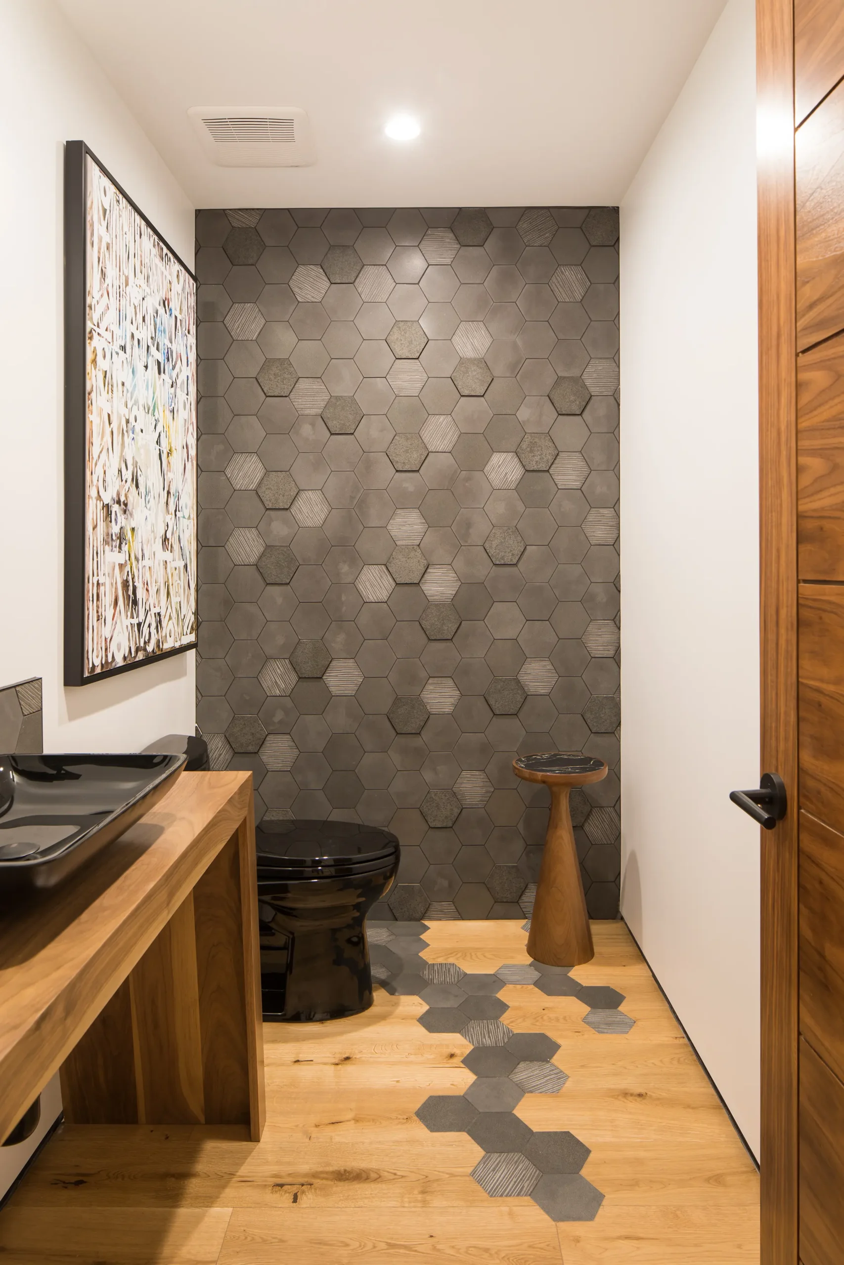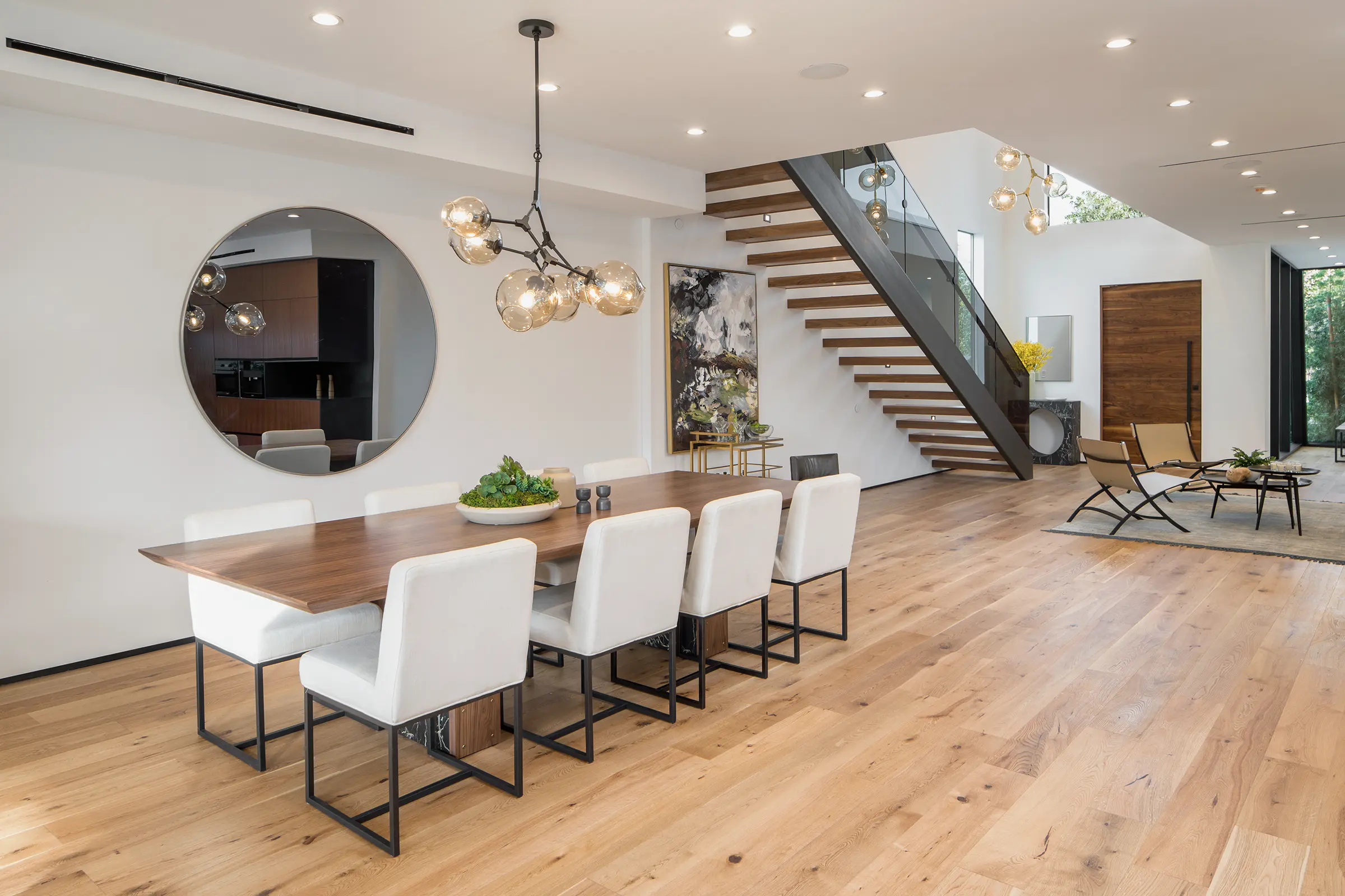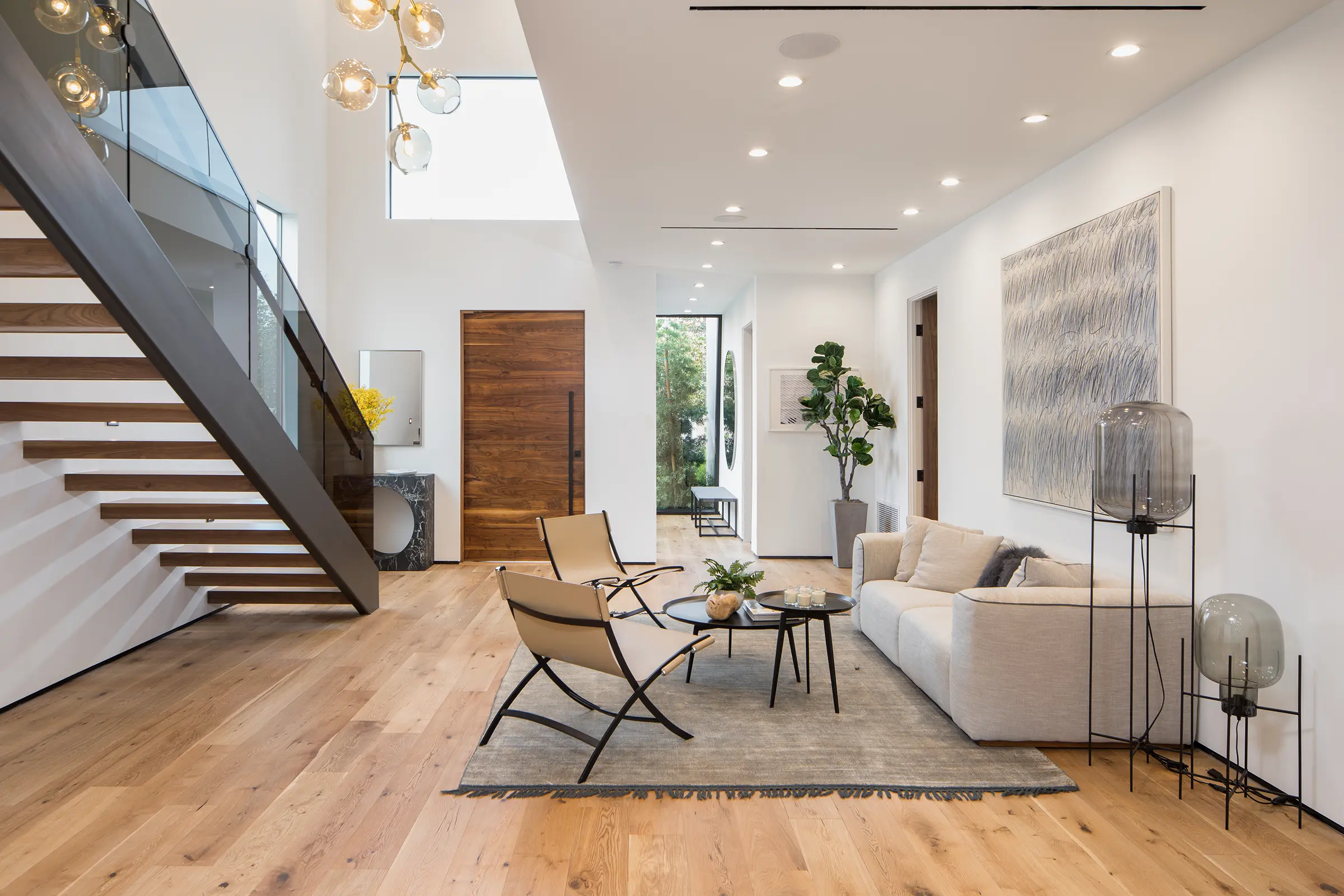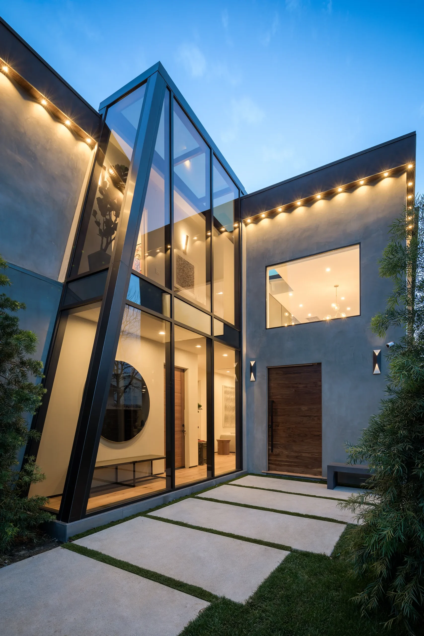 A defining element of the project is the double-height glass entry volume, framed in steel and set at an angular orientation—serving as both a visual focal point and a structural feature requiring precise coordination between framing, glazing, and finish systems. This element establishes the architectural tone of the home while introducing natural light deep into the interior.